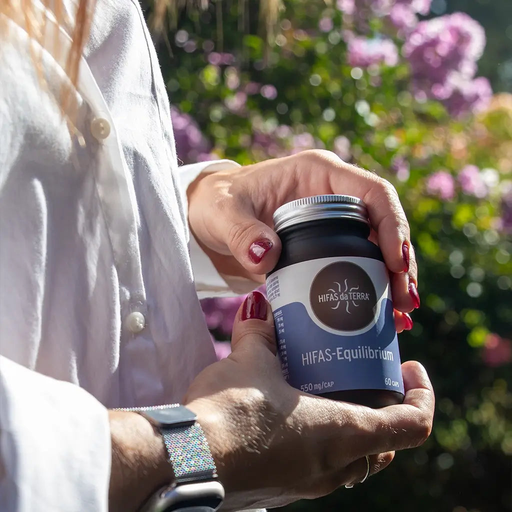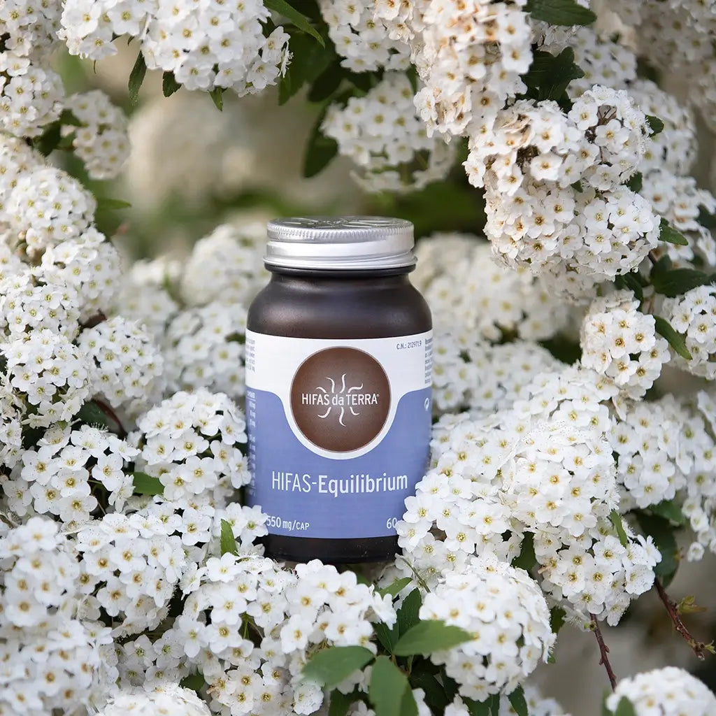 Hifas Equilibrium de Hifas da Terra es un complemento alimenticio en cápsulas que combina extractos de reishi, melena de león y cordyceps, junto con vitamina C natural de acerola. Una fórmula pensada para acompañar el equilibrio diario dentro de una alimentación variada.