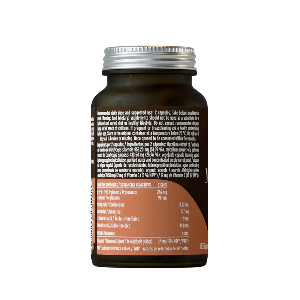 Por dosis (2 cápsulas): extracto biotecnológico de micelio de Cordyceps sinensis (Cordyzumib®) 853,20 mg, micelio de Cordyceps sinensis en polvo 433,54 mg, acerola (Malpighia glabra) 70,58 mg [equivalente a vitamina C 12 mg, 15% VRN]; cápsula vegetal (agua purificada, zumo concentrado de zanahoria morada).