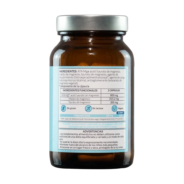 Por dosis (2 cápsulas): ATA Mg acetil taurato de magnesio 800 mg, malato de magnesio 315,2 mg, taurato de magnesio 300 mg, magnesio total 120 mg (32 % VRN). Otros ingredientes: agente de recubrimiento (hidroxipropilmetilcelulosa), agente de carga (celulosa microcristalina), antiaglomerante (estearato de magnesio vegetal).