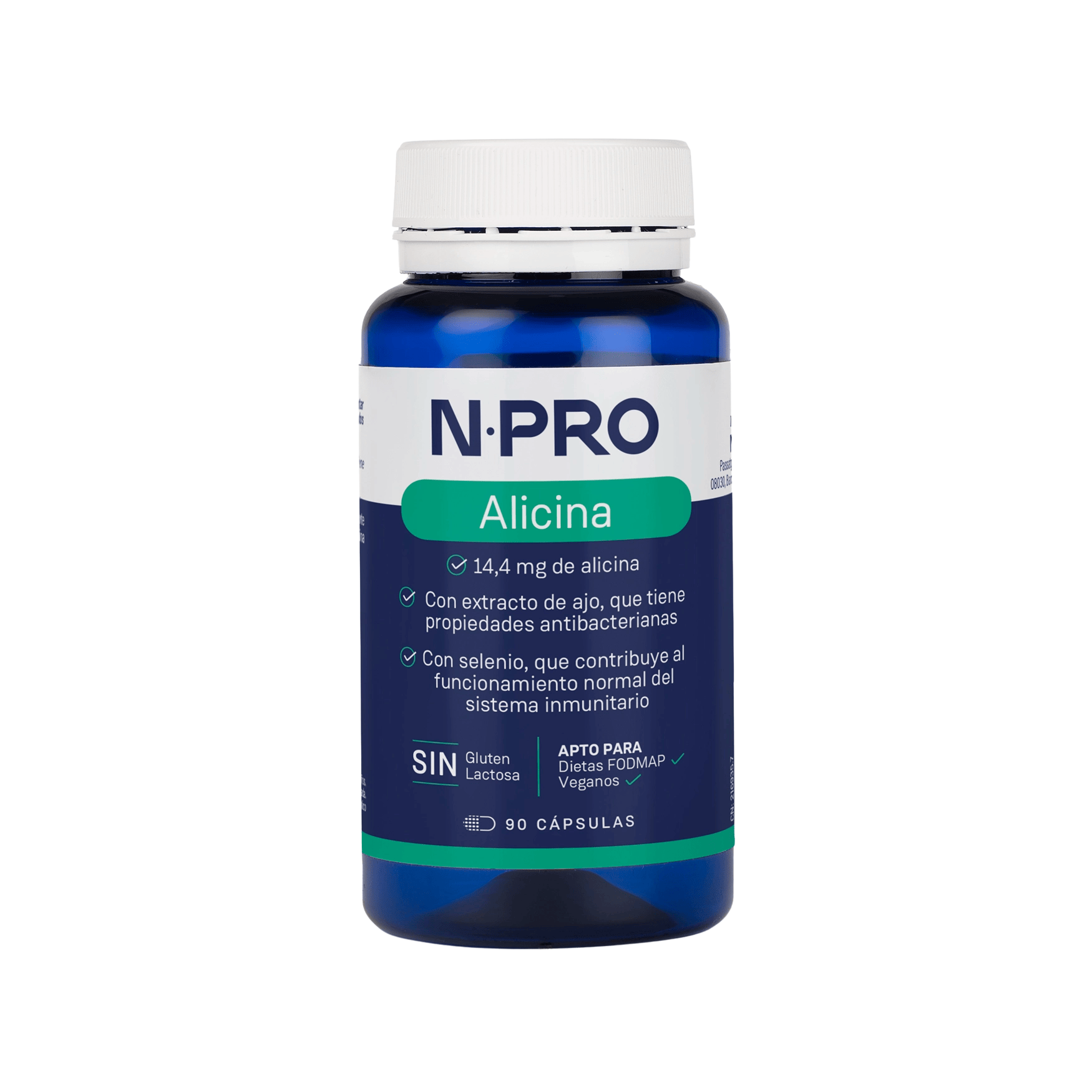 Alicina de NPRO es un complemento alimenticio a base de extracto seco de bulbo de ajo (Allium sativum) estandarizado al 2% en alicina y selenio en forma de seleniometionina. Cada dosis de referencia (2 cápsulas) aporta 720 mg de extracto de ajo y 55 μg de selenio (100% VRN), una forma práctica de obtener compuestos azufrados del ajo junto con este mineral esencial.